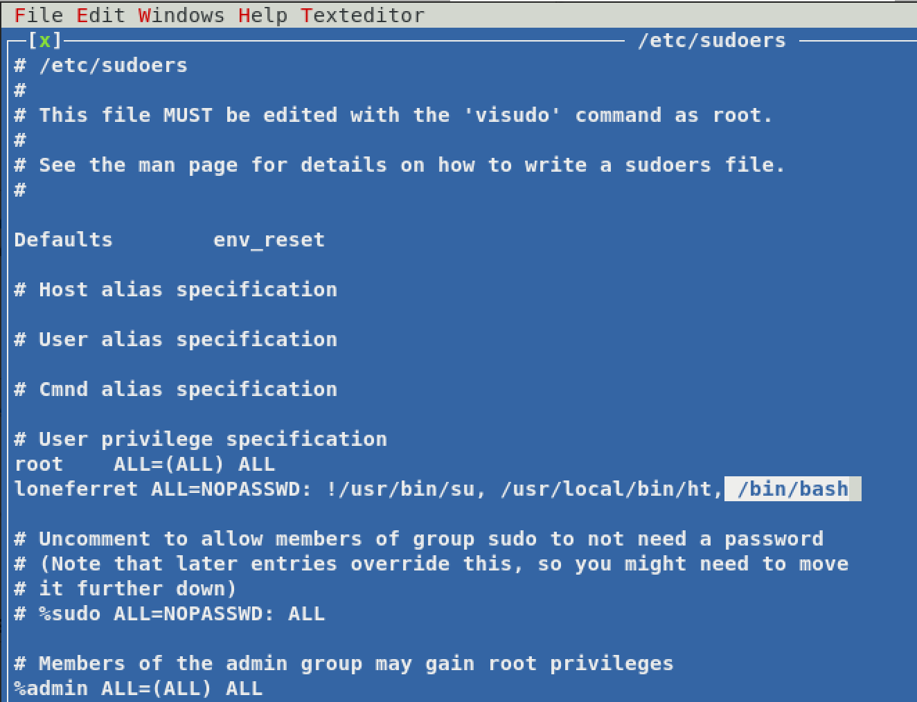 再藉由sudo ht以F3方式開啟/etc/sudoers,將目前帳號加入/bin/bash以藉由root執行bash